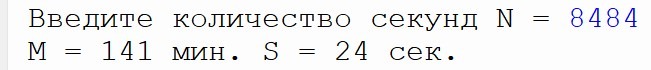 Задание 1. С начала суток прошло N секунд (N — целое).  Найти количество минут и секунд, прошедших с начала последней минуты.  Значение N ввести с клавиатуры.