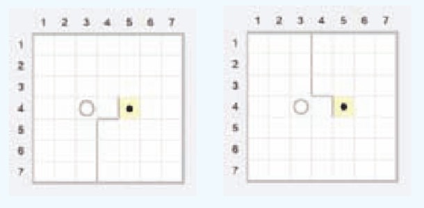 Робот находится в центре поля. Через клетку от робота случайно появляется стена или стены. Нужно закрасить клетку где есть стена и клетку по центру.