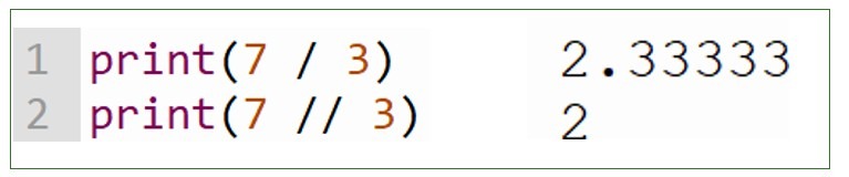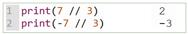 Целочисленное деление (//): Оператор целочисленного деления округляет результат до целого числа не большего результата (к ближайшему меньшему целому).
