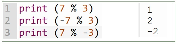 Операция вычисления остатка от деления в Python соответствует математическому определению остатка. Знак остатка всегда соответствует знаку делителя.